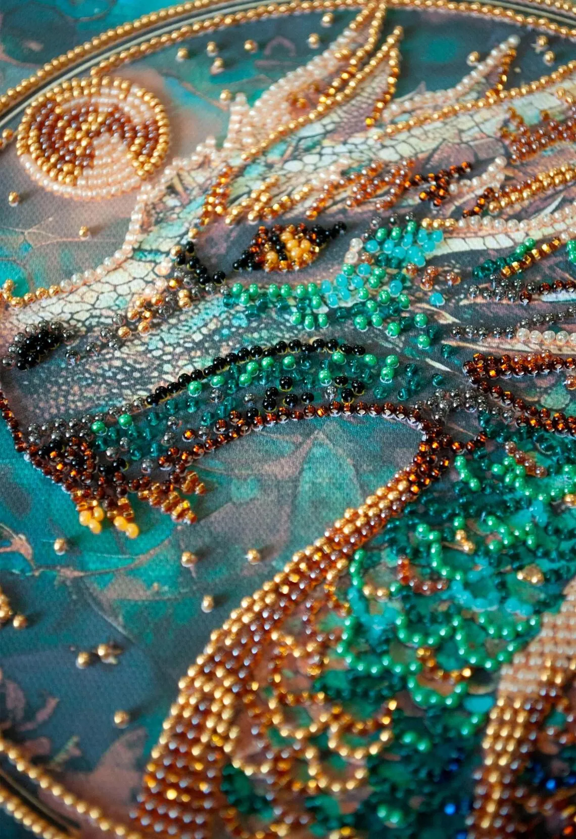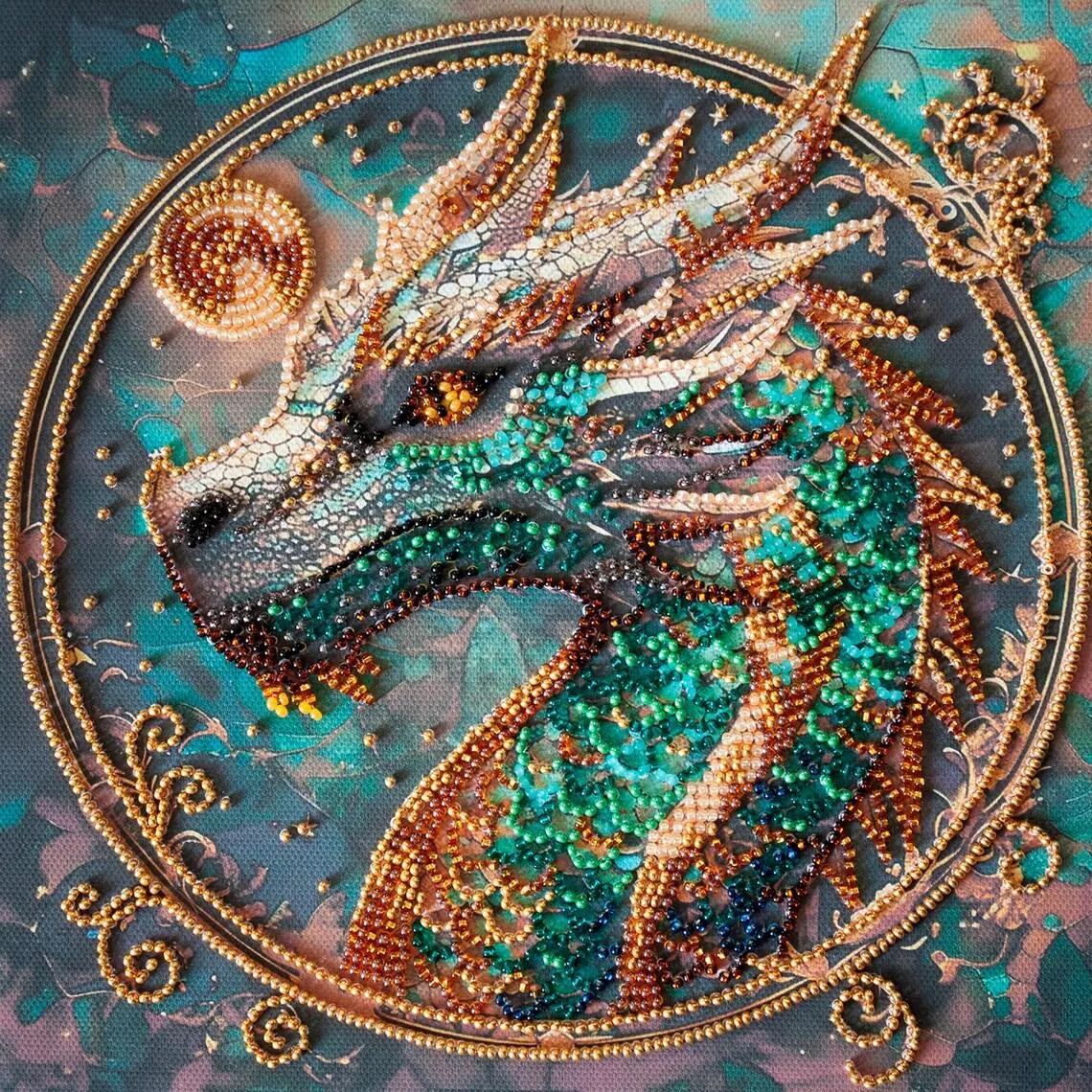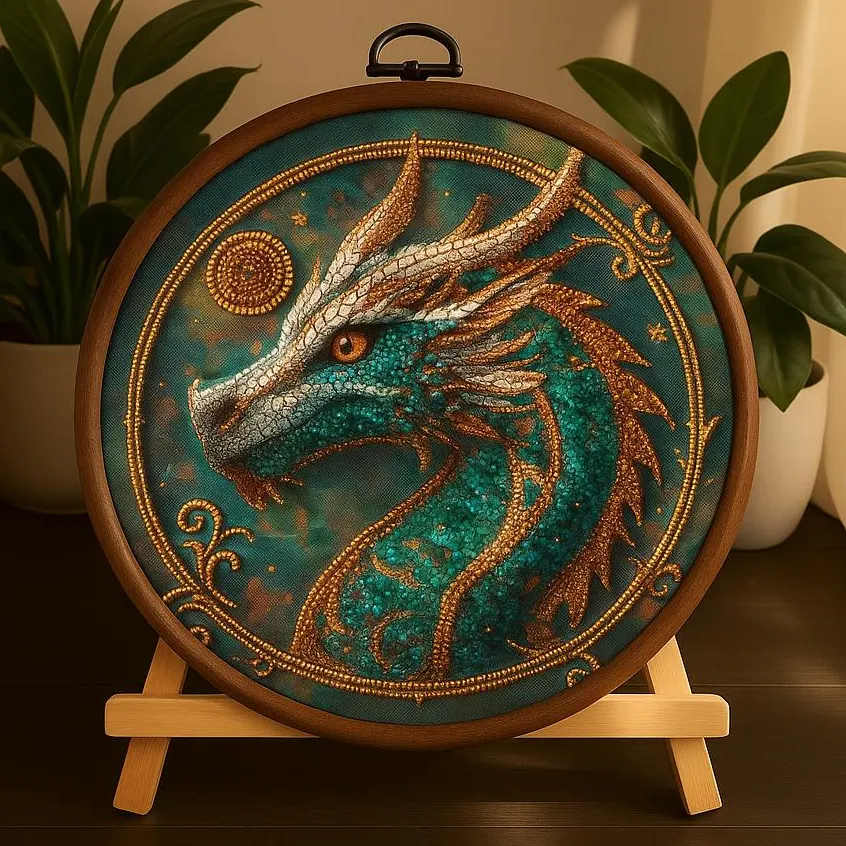 This DIY bead embroidery kit features a detailed dragon design in rich teal and gold tones. The pre-printed full-color fabric is easy to follow, while the beads, microbeads, and decorative stones create a textured and eye-catching finished piece. A great choice for relaxing craft time, display décor, or gifting.