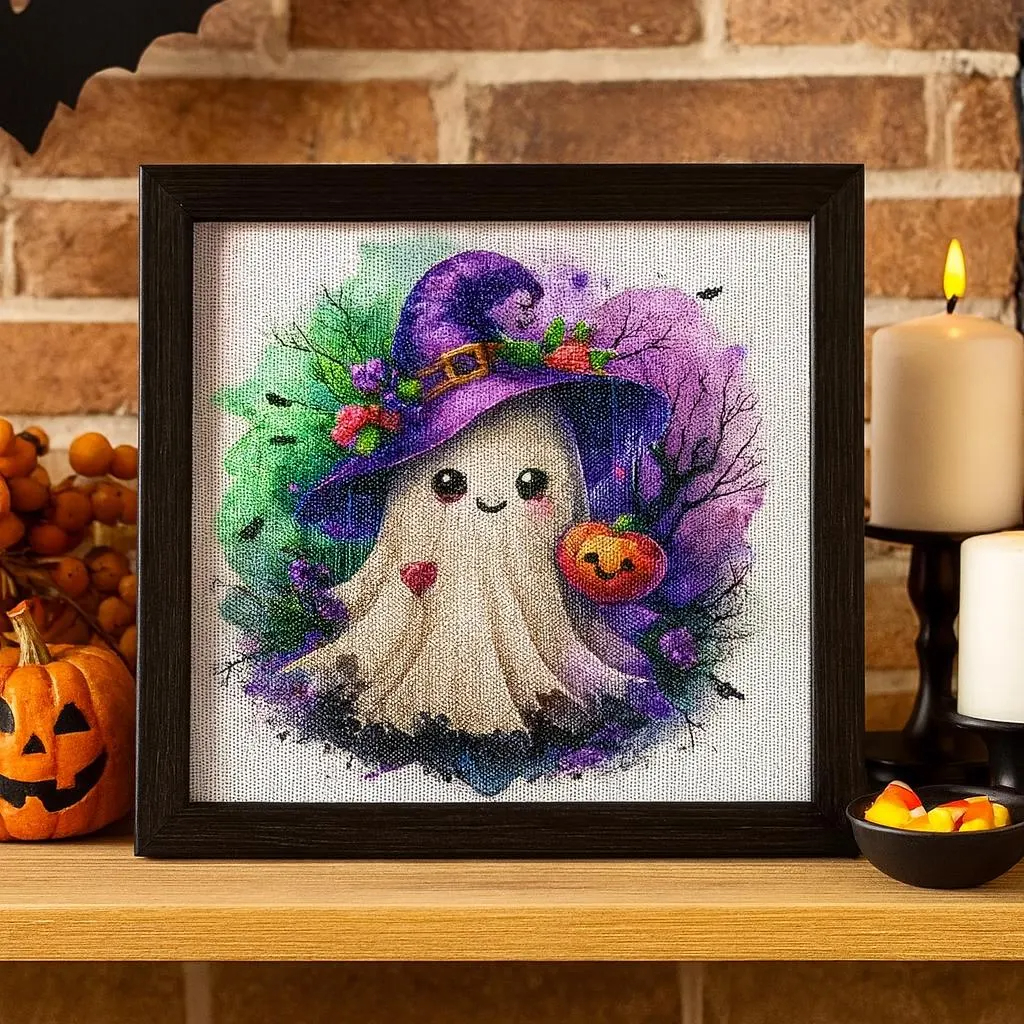 This DIY bead embroidery kit features an adorable Halloween design with a smiling ghost, purple witch hat, and pumpkin accents. The pre-printed full-color fabric is easy to follow, while the seed beads add texture and detail to the finished artwork. A fun choice for seasonal craft projects, festive décor, or gifting.