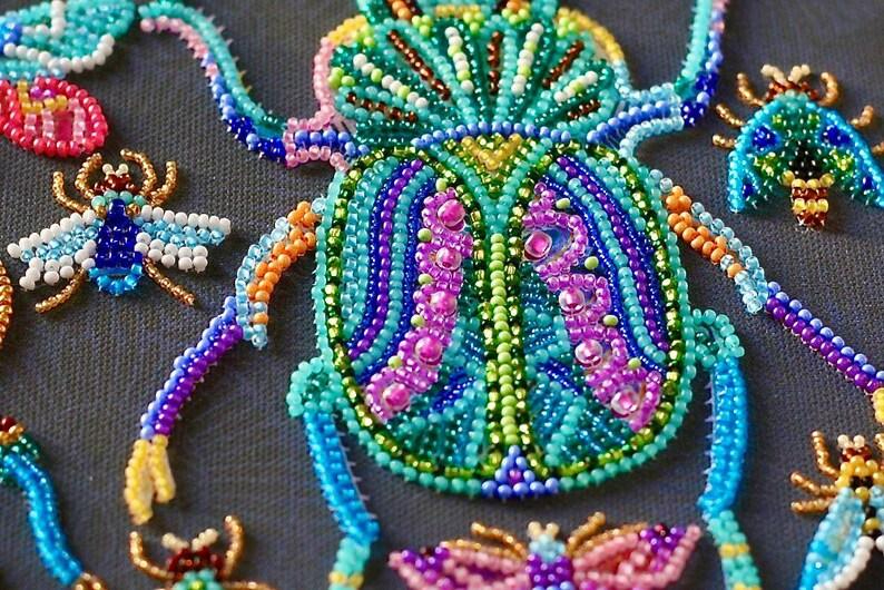 This DIY bead embroidery kit features a striking collection of colorful beetles and insects in a bold artistic style. The pre-printed full-color fabric is easy to follow, while the microbeads and decorative stones add texture, shimmer, and vivid detail to the finished artwork. A great choice for relaxing craft time, unique wall décor, or gifting.