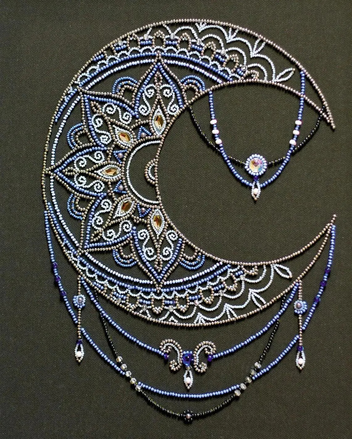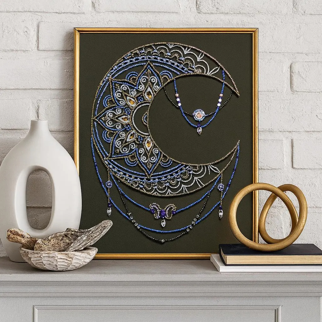 This DIY bead embroidery kit features an elegant crescent moon design with mandala-inspired details and delicate blue ornamental accents. The pre-printed full-color fabric is easy to follow, while the microbeads and decorative stones add shimmer, texture, and depth to the finished artwork. A beautiful choice for relaxing craft time, celestial home décor, or gifting.