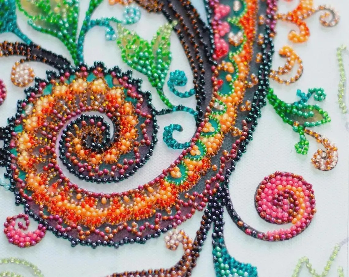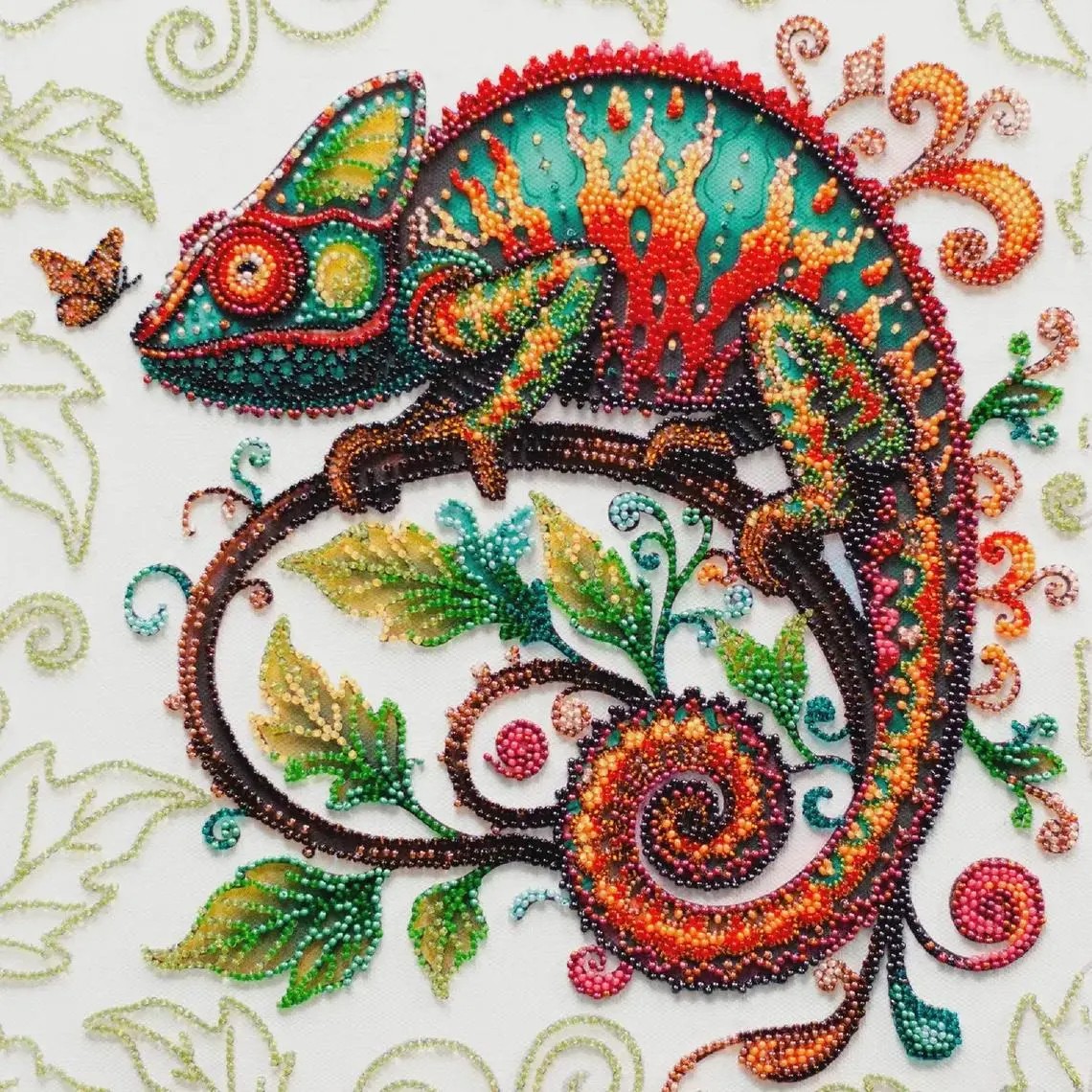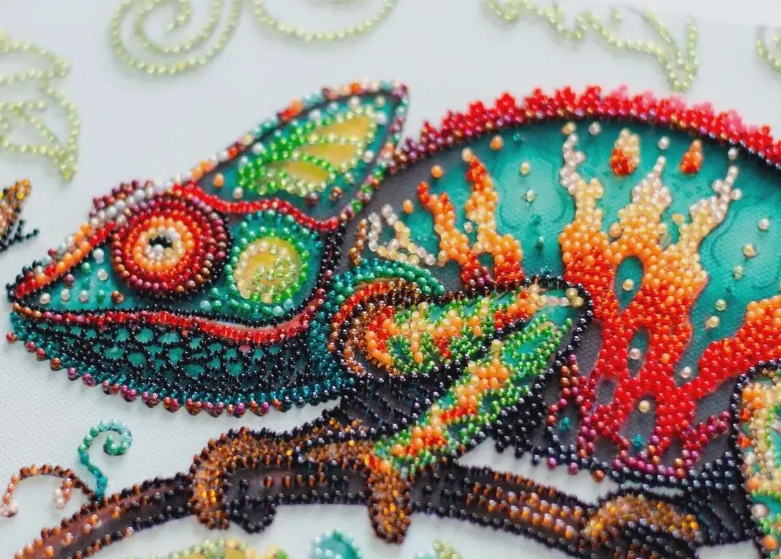 This DIY bead embroidery kit features a vibrant chameleon design with swirling tail details and colorful botanical accents. The pre-printed full-color fabric is easy to follow, while the microbeads and decorative stones add texture, shimmer, and depth to the finished artwork. A striking choice for relaxing craft time, unique home décor, or gifting.