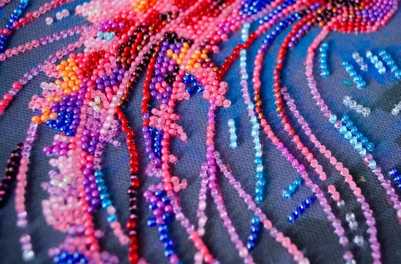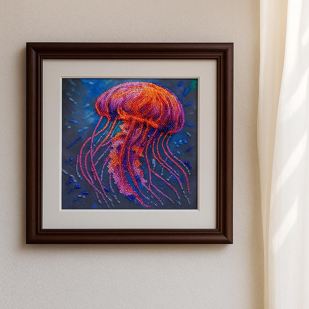 This DIY bead embroidery kit features a vivid jellyfish design in glowing orange, pink, and purple tones against a deep blue background. The pre-printed full-color fabric is easy to follow, while the microbeads and decorative stones add texture, shimmer, and depth to the finished artwork. A beautiful choice for relaxing craft time, ocean-inspired décor, or gifting.