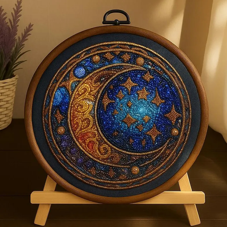 This DIY bead embroidery kit features a beautiful celestial design with a golden crescent moon, stars, and deep blue details. The pre-printed full-color fabric is easy to follow, while the beads, microbeads, and decorative stones create a rich textured finish. A lovely choice for relaxing craft time, home décor, or gifting.
