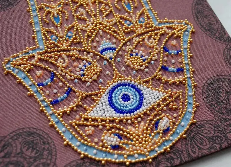 This DIY bead embroidery kit features a striking Hamsa hand design with an eye motif in rich gold and blue tones. The pre-printed full-color fabric is easy to follow, while the microbeads and decorative stones add texture, shine, and detail to the finished piece. A beautiful choice for relaxing craft time, home décor, or gifting.