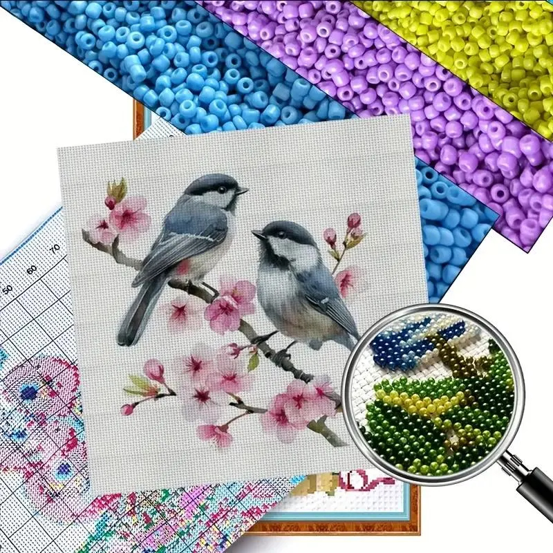 This DIY bead embroidery kit features two charming blue birds perched on a blooming pink blossom branch. The pre-printed full-color fabric is easy to follow, while the seed beads add soft texture and delicate detail to the finished artwork. A lovely choice for relaxing craft time, nature-inspired décor, or gifting.
