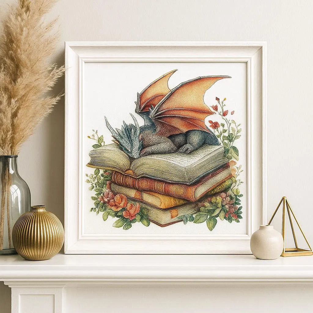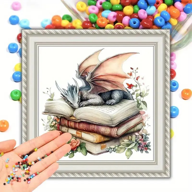 This DIY bead embroidery kit features a charming fantasy design with a resting dragon curled up on a stack of books. The pre-printed full-color fabric is easy to follow, while the seed beads add delicate texture and detail to the finished artwork. A lovely choice for relaxing craft time, cozy home décor, or gifting.
