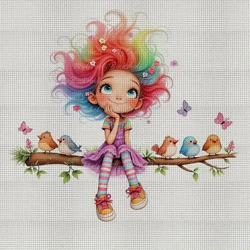 This DIY bead embroidery kit features a whimsical girl with bright rainbow hair sitting on a branch with little birds and butterflies. The pre-printed full-color fabric is easy to follow, while the seed beads add texture and detail to the finished artwork. A charming choice for relaxing craft time, creative décor, or gifting.
