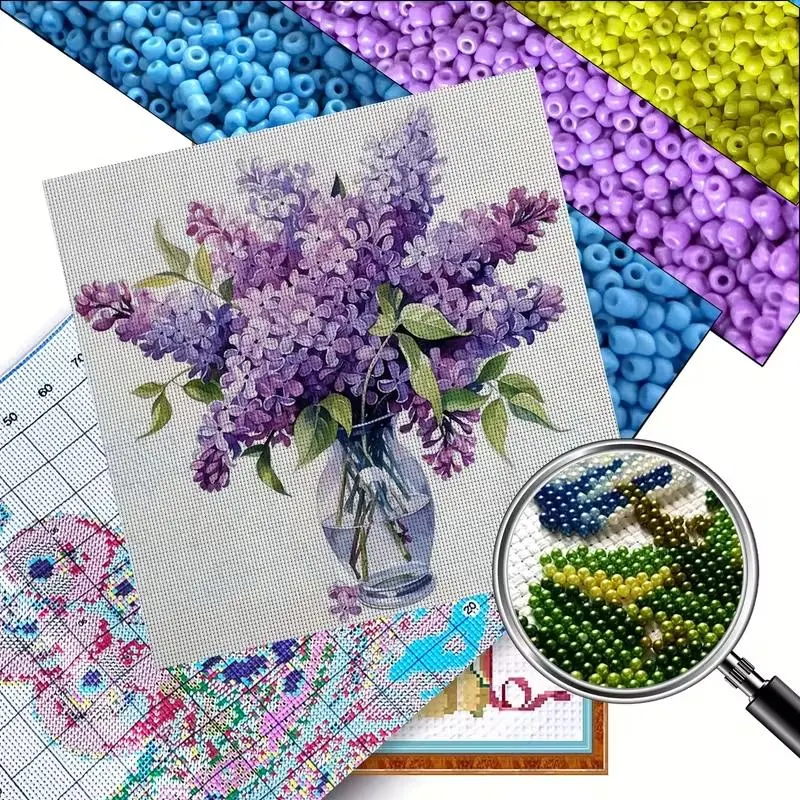 This DIY bead embroidery kit features a lovely bouquet of purple lilacs arranged in a glass vase. The pre-printed full-color fabric is easy to follow, while the seed beads add soft texture and delicate detail to the finished artwork. A beautiful choice for relaxing craft time, floral home décor, or gifting.