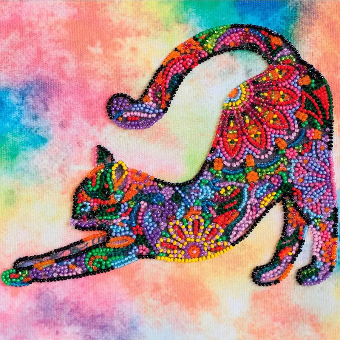 This DIY bead embroidery kit features a vibrant stretching cat design filled with colorful floral-style patterns. The pre-printed full-color fabric is easy to follow, while the beadwork creates a bright, textured finished piece. A fun choice for relaxing craft time, creative home décor, or gifting.